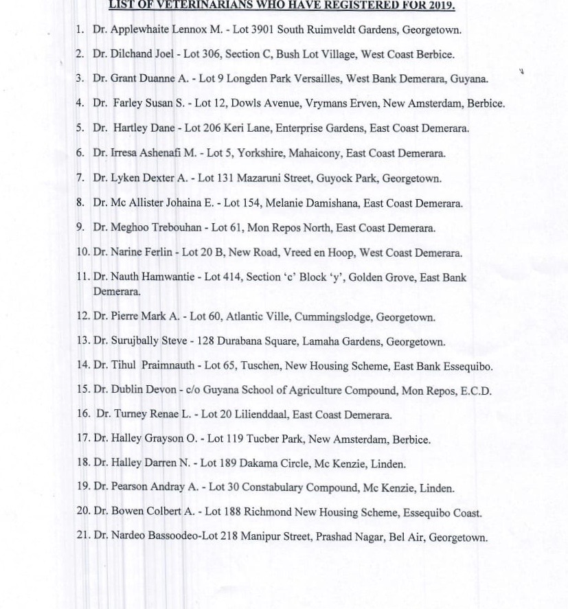 We do not provide Veterinary Advice, but we can refer you to a qualified person in your area. See below for the list of Vets and Animal Health Assistants who have Registered with the Veterinary Board in Guyana for 2019.